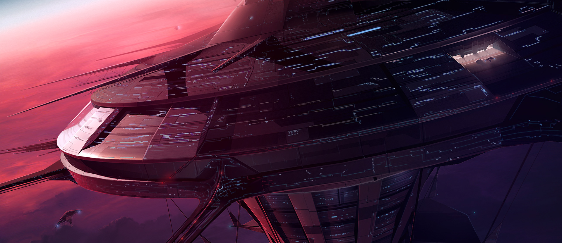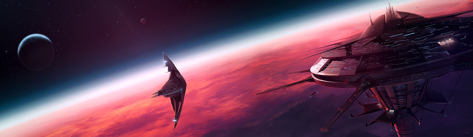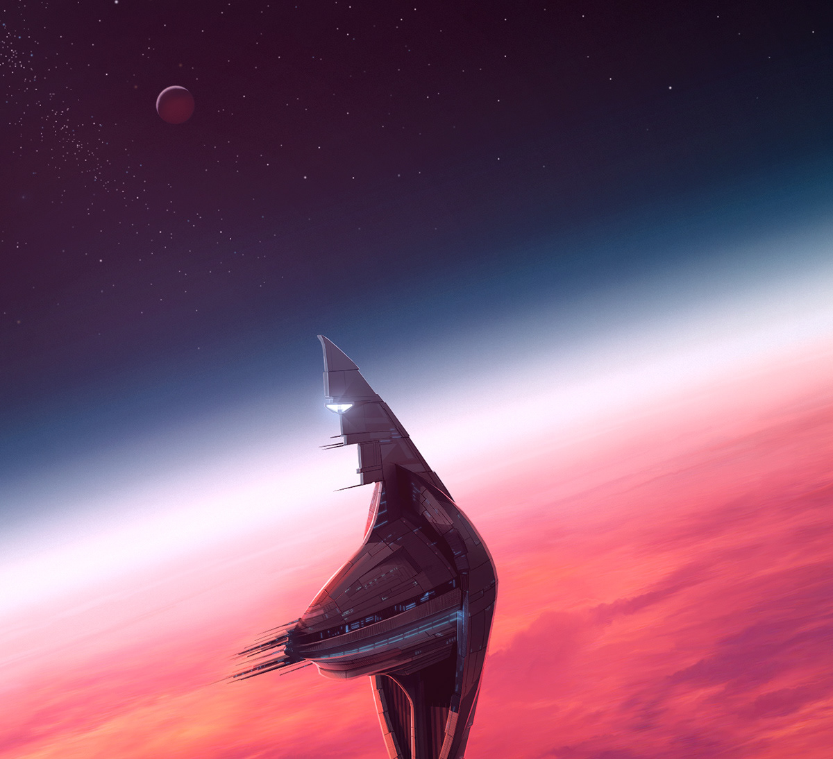 Passenger vessel approaching a huge space dock orbiting a red planet.