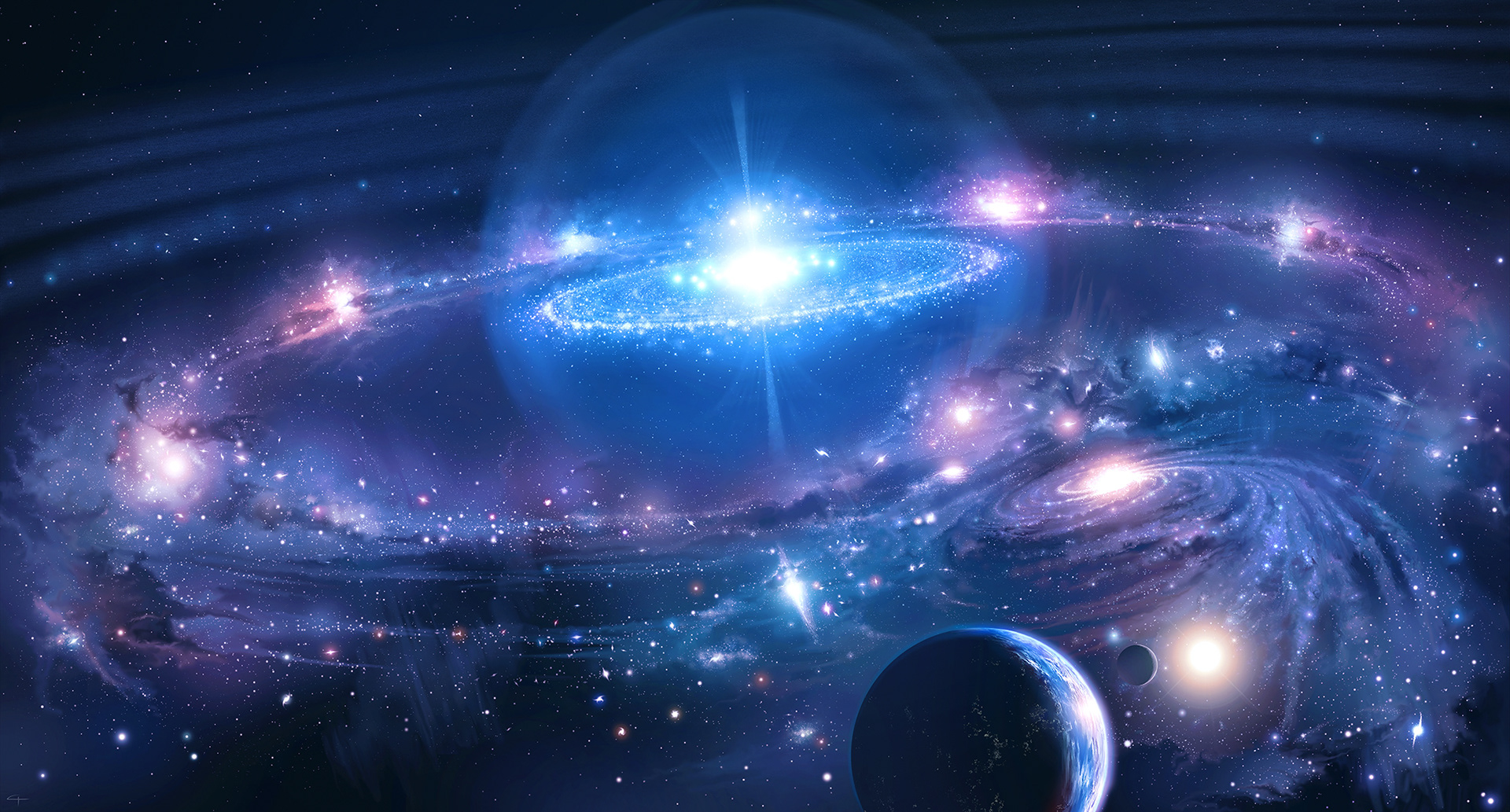 A depiction of the current inhabited universe - using information in The Urantia Book. Subsequent to painting this I realised some of the details are not accurate, but it still services as in inspirational piece.